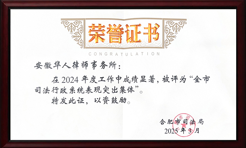 优质的服务,为华人律师赢来荣誉等身。成立以来,华人律师事务所先后获得“安徽省优秀品牌律师事务所”、“全国优秀律师事务所”、“安徽省青年文明号”、“全国青年文明号”、“纳税先进单位”、“档案管理一级单位”、“巾帼文明岗”、“安徽省综合实力五十强”、“安徽省综合实力前十强”等多项荣誉称号。