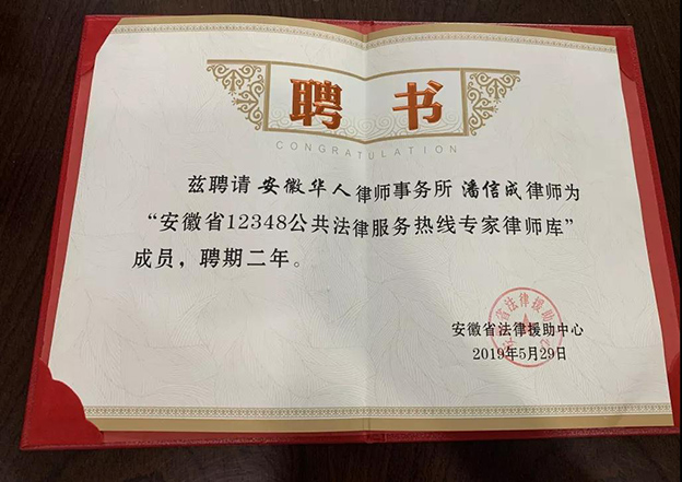 本所潘信成律师入选“安徽省12348公共法律服务热线专家律师库”