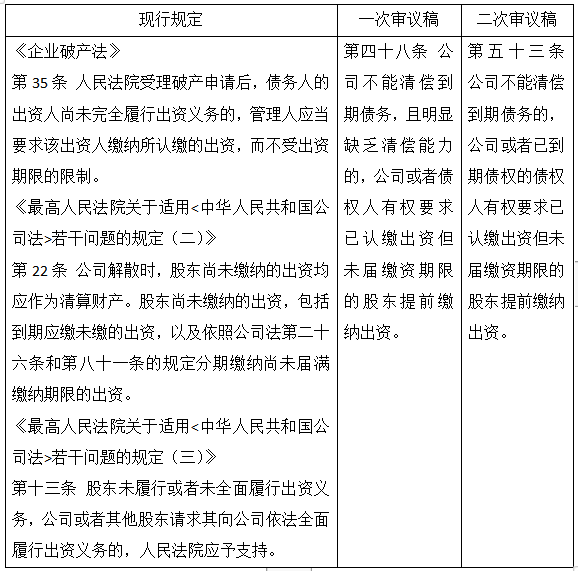 如前所述,本次公司法修订前,在注册资本认缴制背景下,仅能依据《企业破产法》第35条,参照适用《最高人民法院关于适用<中华人民共和国公司法>若干问题的规定(二)》第22条第1款和《最高人民法院关于适用<中华人民共和国公司法>若干问题的规定(三)》第十三条的规定,根据《全国法院民商事审判工作会议纪要》第6条的规定进行说理,要求已认缴但未届缴资期限的股东提前缴纳出资。但适用前述规定需要在进入破产、强制清算程序后或者执行阶段终结后,才可要求股东出资加速到期。而本次公司法修订正式在公司法层面明确了股东认缴出资加速到期制度,更好的保护了公司债权人的利益。与一次审议稿相比,二次审议稿删除了“且明显缺乏清偿能力”这一法律要件,降低了股东认缴出资加速到期的适用条件,体现出当股东出资期限利益与公司外部债务清偿责任相冲突时,更加注重保护公司债权人利益的立法倾向。
