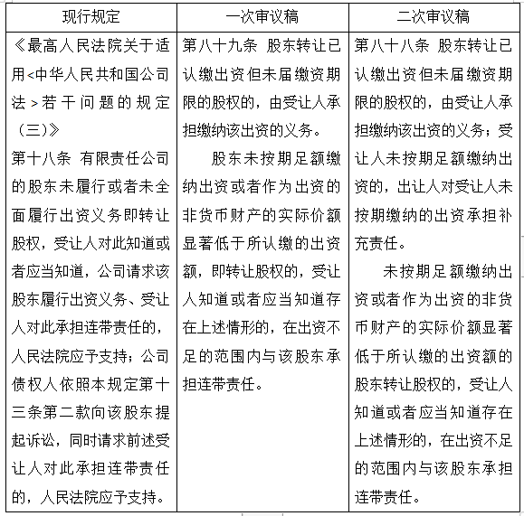 如前所述,在注册资本认缴制下,股东享有出资期限利益,注册资本只认缴不实缴,股权转让时,往往认缴期限尚未届至,出让股东在未实缴的情况下即转让股份,并将后续实缴出资义务转嫁给了受让股东,在法律和司法解释没有明确规定转让已认缴但未届缴资期限出资后出让股东要对受让股东承担补充责任的情况下,不利于保护公司债权人的利益。因此在公司法修订案中增加了出让股东对受让股东已认缴但未届缴资期限的出资承担补充责任。一次审议稿中,针对转让已认缴出资但未届缴资期限的股权,规定由受让股东承担缴纳该出资的义务,同时规定出让股东未按期足额缴纳出资或者出资存在瑕疵的情况下,受让股东知道或者应当知道该情形的,受让股东在出资不足的范围内与出让股东承担连带责任。二次审议稿中,增加了出让股东的补充责任,即受让股东未按期足额缴纳出资的,出让股东对受让股东未按期缴纳的出资承担补充责任,从而更好地维护公司债权人的利益。