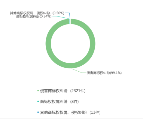 从上面的案由分类情况可以看到,当前最主要的案由是侵害商标权纠纷,有2321件,占一半以上,其次是其他商标权权属、侵权纠纷,商标权权属纠纷。
