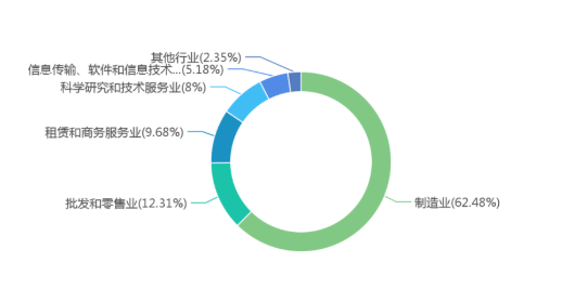 从上面的行业分类情况可以看到,当前的行业分布主要集中在制造业,批发和零售业,租赁和商务服务业,科学研究和技术服务业,信息传输、软件和信息技术服务业。