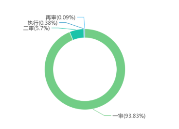 从上面的程序分类统计可以得出当前的审理程序分布状况,其中一审案件有2221件,二审案件有135件,再审案件有2件,执行案件有9件。并能够推算出一审上诉率约为6.08%。
