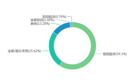 通过对一审裁判结果的可视化分析可以看到,当前条件下撤回起诉的有1317件,占比为59.30%;全部/部分支持的有569件,占比为25.62%;其他的有295件,占比为13.28%。