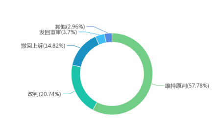 通过对二审裁判结果的可视化分析可以看到,当前条件下维持原判的有78件,占比为57.78%;改判的有28件,占比为20.74%;撤回上诉的有20件,占比为14.81%。