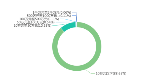 通过对标的额的可视化分析可以看到,标的额为10万元以下的案件数量最多,有1633件,10万元至50万元的案件有194件,50万元至100万元的案件有10件,100万元至500万元的案件有2件,500万元至1000万元的案件有2件。