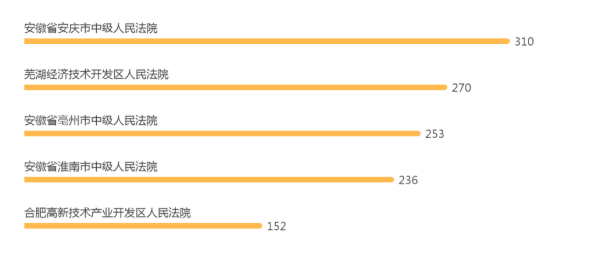 通过对法院的可视化分析可以看到,审理案件由多至少的法院分别为安徽省安庆市中级人民法院、芜湖经济技术开发区人民法院、安徽省亳州市中级人民法院、安徽省淮南市中级人民法院、合肥高新技术产业开发区人民法院。