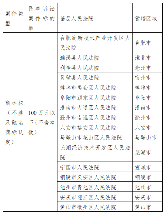 根据《最高人民法院关于第一审知识产权民事、行政案件管辖的若干规定》第二条第一款规定“外观设计专利的权属、侵权纠纷以及涉驰名商标认定第一审民事、行政案件由知识产权法院和中级人民法院管辖;经最高人民法院批准,也可以由基层人民法院管辖,但外观设计专利行政案件除外。”及第三条规定“本规定第一条、第二条规定之外的第一审知识产权民事、行政案件,由最高人民法院确定的基层人民法院管辖。”,以及《最高人民法院关于印发基层人民法院管辖第一审知识产权民事、行政案件标准的通知》(2022年5月1日起施行)中关于安徽省管辖法院的规定,安徽省商标侵权案件标的额在100万以下(不含本数)的除涉驰名商标认定案件,一审由最高人民法院指定的有管辖权的基层人民法院管辖;标的额100万以上(含本数)或涉驰名商标认定案件,一审由各地中级人民法院管辖,其中关于最高院确定的有管辖权的安徽省基层人民法院参照如下表格: