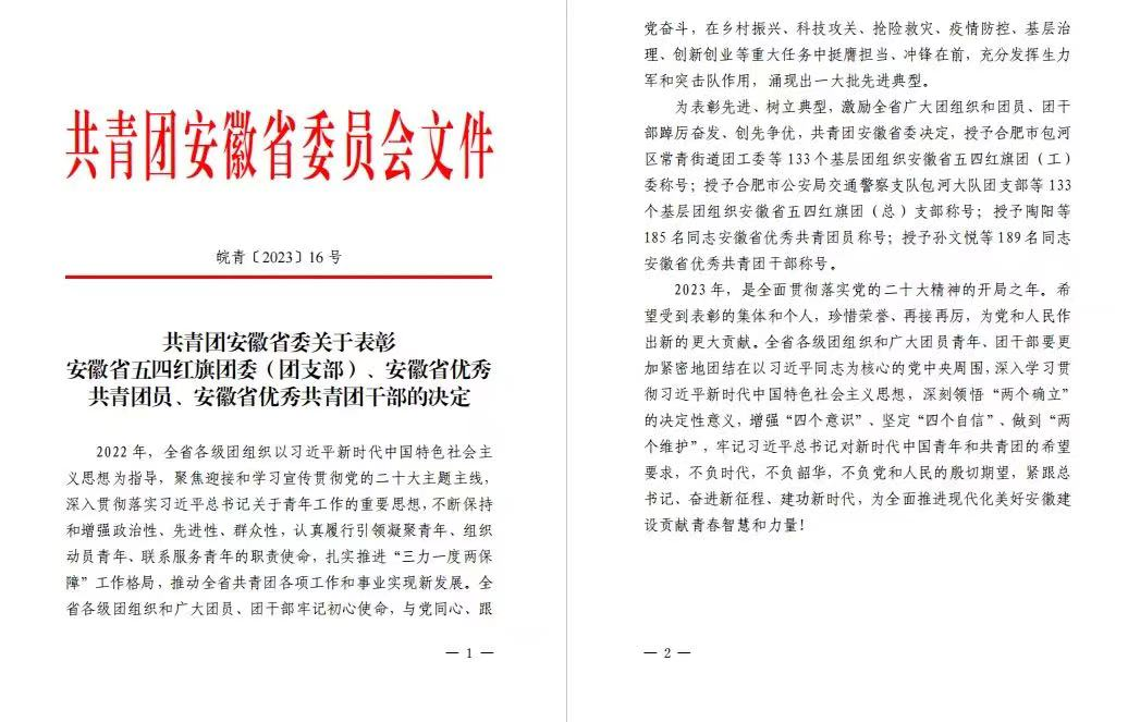 近日,团省委印发《共青团安徽省委关于表彰安徽省五四红旗团委(团支部)、安徽省优秀共青团员、安徽省优秀共青团干部的决定》。