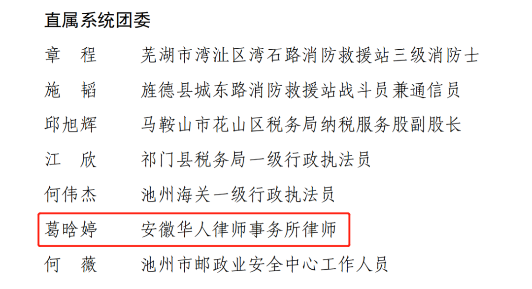荣誉丨热烈祝贺华人所葛晗婷律师被授予“安徽省优秀共青团员”荣誉称号