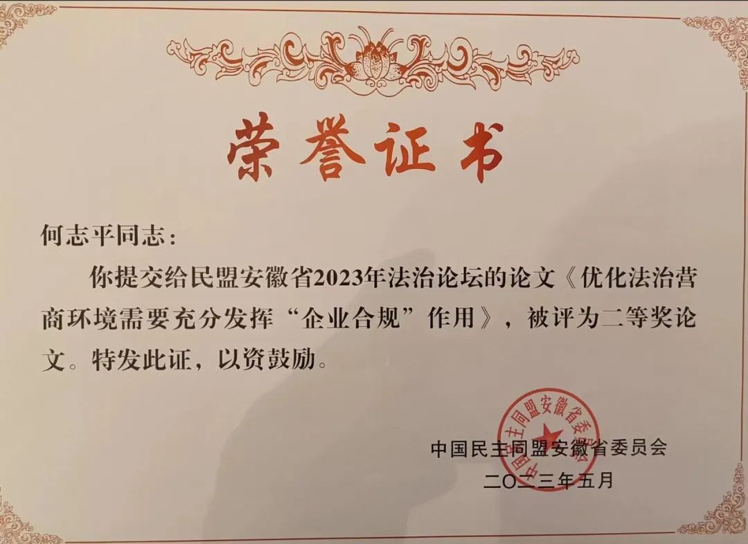 本届论坛收到全省民盟组织和省司法系统报送的论文共154篇,经专家评审出组织奖9个,论文一等奖10篇、二等奖15篇、三等奖25篇。华人所何志平律师撰写的《优化法治营商环境需要充分发挥“企业合规”作用》一文在众多论文当中,表现优秀,被评为“二等奖”。