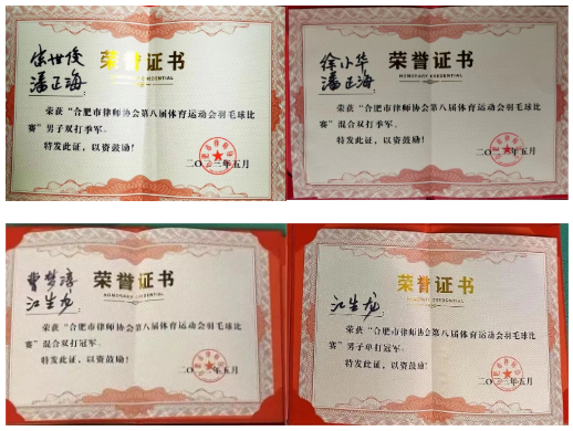运动唤醒体育的激情,沉稳的步伐,坚韧的毅力,最终迎来胜利的荣耀,经过激烈的角逐,华人律师取得了优异的成绩,充分展现了律师奋勇争先、拼搏突破的精神。华人所江生龙律师荣获羽毛球男子单打、混合双打冠军;潘正海律师荣获羽毛球男子双打、混合双打季军;常新宇律师入选第十届安徽省律师体育友谊赛男子三人制篮球比赛名单。
