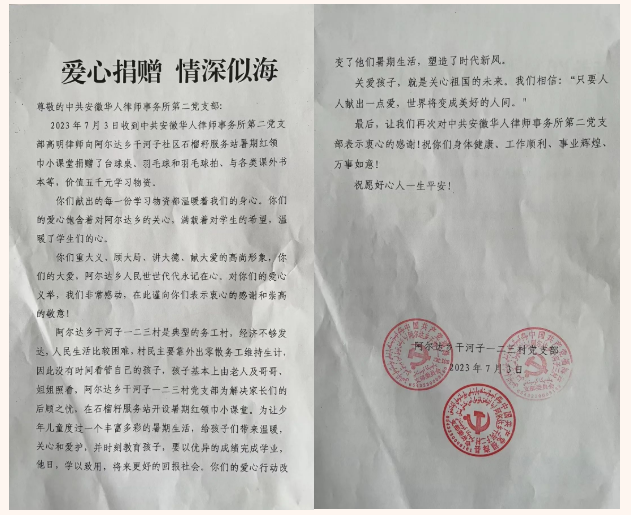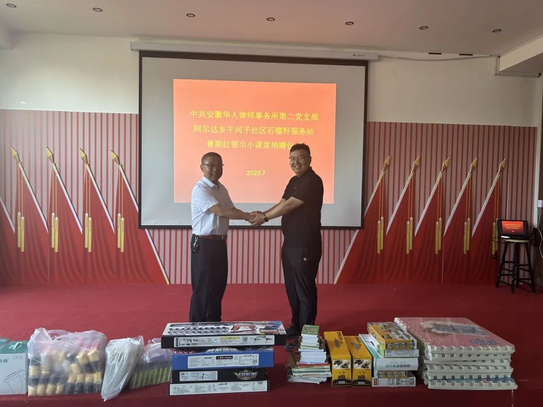 7月3日,中共安徽华人律师事务所第二党支部向新疆福海县阿尔达乡干河子社区石榴籽服务站“暑期红领巾小课堂”捐赠了价值五千元的图书和体育用品等。