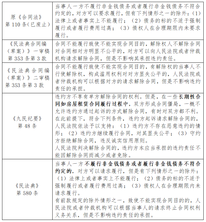 笔者之所以列举以上两个案例,是因为其分别代表了违约方履行“非金钱债务”与“金钱债务”两种情形。现有法律仅规定了履行非金钱债务的违约方解除合同的情形,对于履行金钱债务的违约方在特定情况下是否有权解除合同,尚无明确法律依据,司法实践中对该问题也存在较大争议。为了理清这一问题,势必要先对违约方解除合同的相关依据进行归纳、整理。