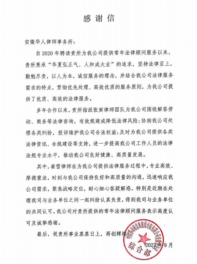 这封感谢信,是鼓励更是鞭策!今后,华人所将一如既往地致力于为广大客户提供更加卓越的法律服务,陪伴客户共同成长,为社会高质量发展贡献力量。