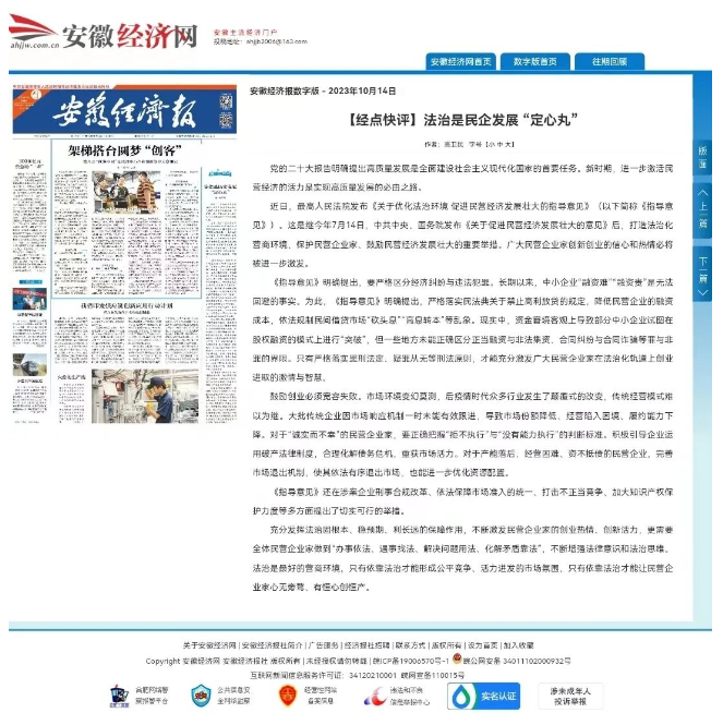 安徽华人律师事务所合伙人、新兴业务专业委员会主任高卫民律师撰写的评论文章《法治是民企发展 “定心丸”》,在2023年10月14日出版的《安徽经济报》头版刊发,全文如下。