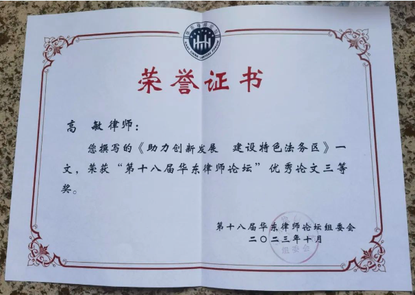 10月27日—29日,第十八届华东律师论坛在江苏南京举办。本次论坛以“发展与共赢”为主题,六省一市律师协会共同参与。通过安徽省律师协会层层选拔,华人所高敏律师撰写的《助力创新发展 建设特色法务区》入选第十八届华东律师论文集并荣获优秀论文三等奖。