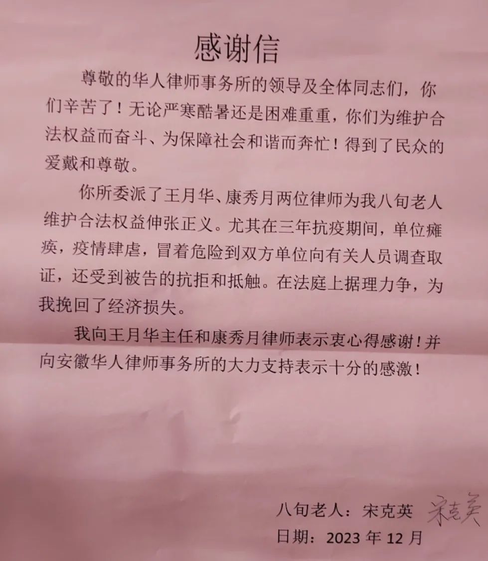 近日,华人所王月华律师、康秀月律师荣幸地收到了来自客户的感谢信和锦旗。这封感谢信和锦旗不仅是对两位律师专业能力和真诚付出的肯定,更是对华人所优质服务的认可。