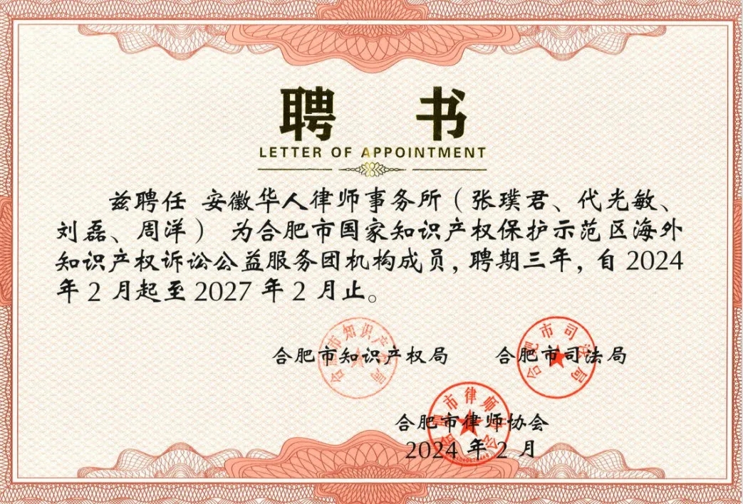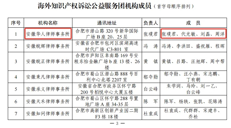 华人所将以此次入选合肥市国家知识产权保护示范区海外知识产权诉讼公益服务团机构成员为动力,积极履行职责,参与海外知识产权布局保护、指导应对纠纷;协助海外知识产权重大、疑难案件处理;参与海外知识产权纠纷诉讼等公益服务,为创新主体海外知识产权保护和纠纷应对提供智力支撑,助力安徽省知识产权高质量发展。