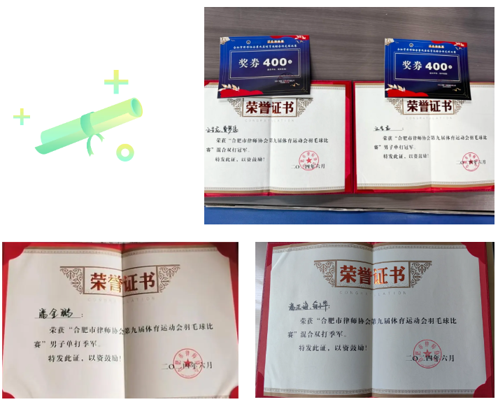 在激烈的角逐中,华人所的江生龙律师携手搭档,荣获羽毛球混合双打冠军和男子单打冠军;潘正海律师凭借默契的配合和出色的表现,荣获羽毛球混合双打季军;潘金鹏律师一路过关斩将,最终获得羽毛球男子单打季军。他们取得佳绩不仅为华人所赢得了荣誉,更激励着每一位律师以更加饱满的热情投入到体育活动中。