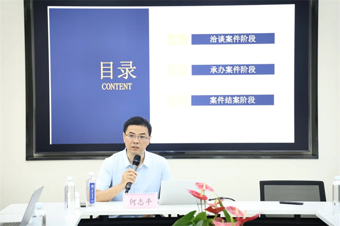 为了帮助全所律师深切认识到刑事案件中存在的执业风险,何志平从洽谈案件阶段、承办案件阶段、案件结案阶段三个方面分别通过列举案例、引用法条、亲身经历等方式进行了详细的讲解。培训交流环节,何志平就刑事案件执业中遇到的问题与参会律师进行了深入交流,并对参会律师提出的关于刑事案件执业风险方面的疑惑进行了细致分析与解答,更好的帮助参会律师了解和把控刑事案件中的执业风险。