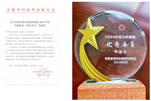 华人资讯 | 华人所陶振全律师荣获安徽省侨联法顾委“优秀委员”称号