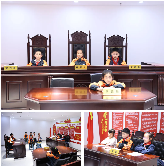 活动当天,学生们怀揣着好奇与兴奋踏入律所。在何志平律师引导下,孩子们迅速被法庭的庄严氛围吸引。模拟法庭环节,孩子们分别扮演法官、检察官、律师、书记员和被告等角色,在何志平、袁梅、史斌律师的细致指导下,依照庭审程序,进行了一场“校园霸凌案”模拟审判。