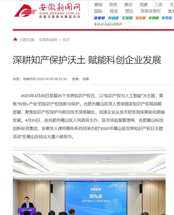 近日,由合肥市蜀山区人民政府主办,区市场监督管理局、合肥蜀山科技创新投资集团、安徽华人律师事务所共同承办的"2025年蜀山区世界知识产权日主题活动"引发广泛关注,央广网、今日头条、安徽新闻网、安徽财经网、安徽卫视以及合肥新闻联播等多家媒体纷纷对活动进行报道。