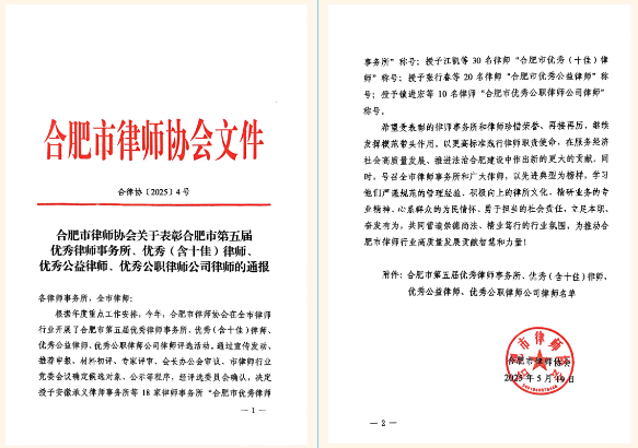 首夏犹清和,喜讯满庭芳。在合肥市第五届律师行业表彰活动中,安徽华人律师事务所凭借深厚的专业积淀与坚定的社会担当,荣获“合肥市优秀律师事务所”称号。与此同时,洪波、何志平两位律师荣膺“合肥市优秀律师”,高明律师喜获“合肥市优秀公益律师”殊荣,为律所发展再添璀璨华章。