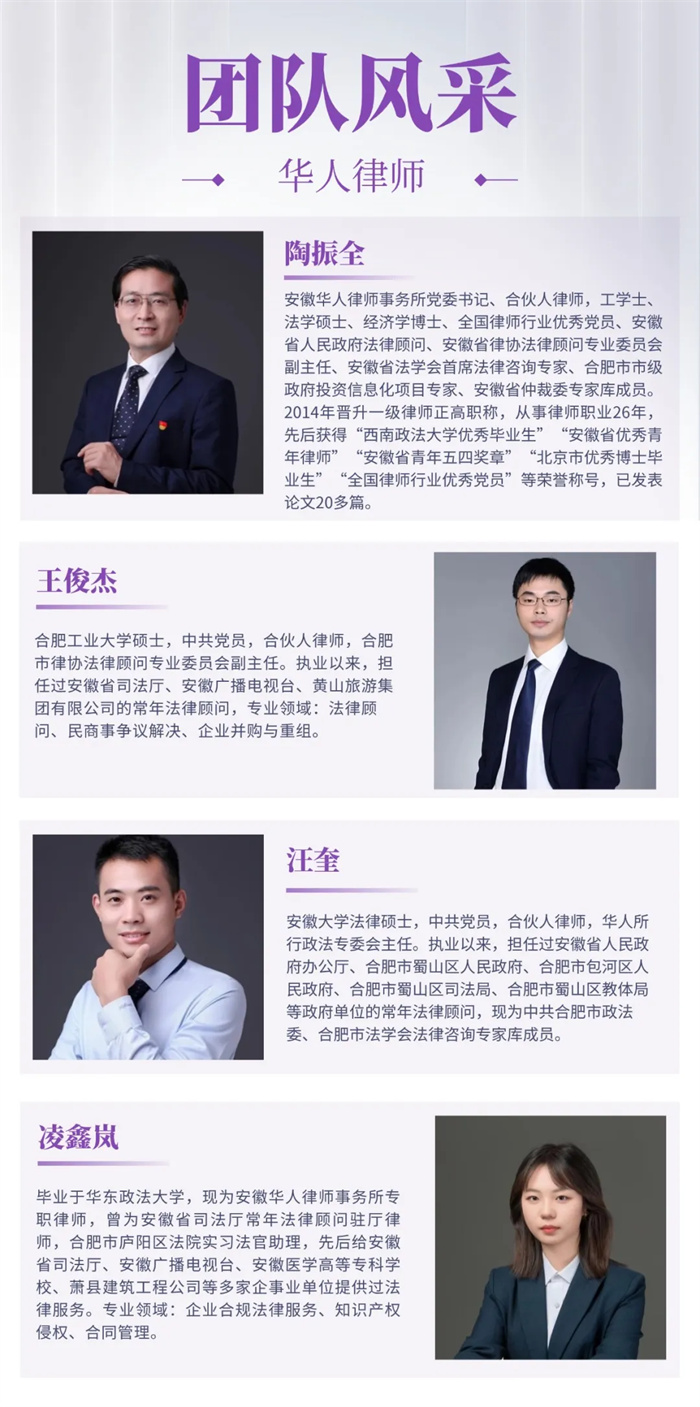 本项目由华人所党委书记陶振全、合伙人王俊杰牵头,组建了一支包含汪奎律师,凌鑫岚律师等精英律师的专业团队,团队成员在各自领域均具有深厚的专业知识和丰富的实践经验,能够为省政府提供全方位、高质量的法律服务。