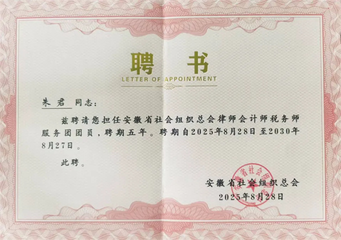 近日,安徽省社会组织总会正式发布聘任通知,我所合伙人朱君律师凭借三重专业复合背景、十余年实务经验,以及在合规治理、公益服务领域的突出表现,成功受聘为安徽省社会组织总会律师会计师税务师服务团团员。